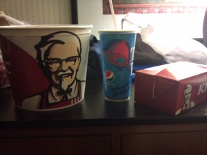 Saímos do hotel para almoçar e paramos em Um KFC (Kentucky Fried Chicken) como nem eu e nem o meu companheiro de viagem sabíamos como pedir algo no restaurante topamos rachar um tradicional balde de frango com 12 pedaços. Até aí tudo bem… Na hora de fazer o pedido descobrimos que o balde era imenso, vinha com 4 espigas de milho, purê de batatas, macarrão com queijo e seis broas de milho. Comida para no mínimo seis pessoas. Ouch! Comi tanto que não conseguia nem me mexer.