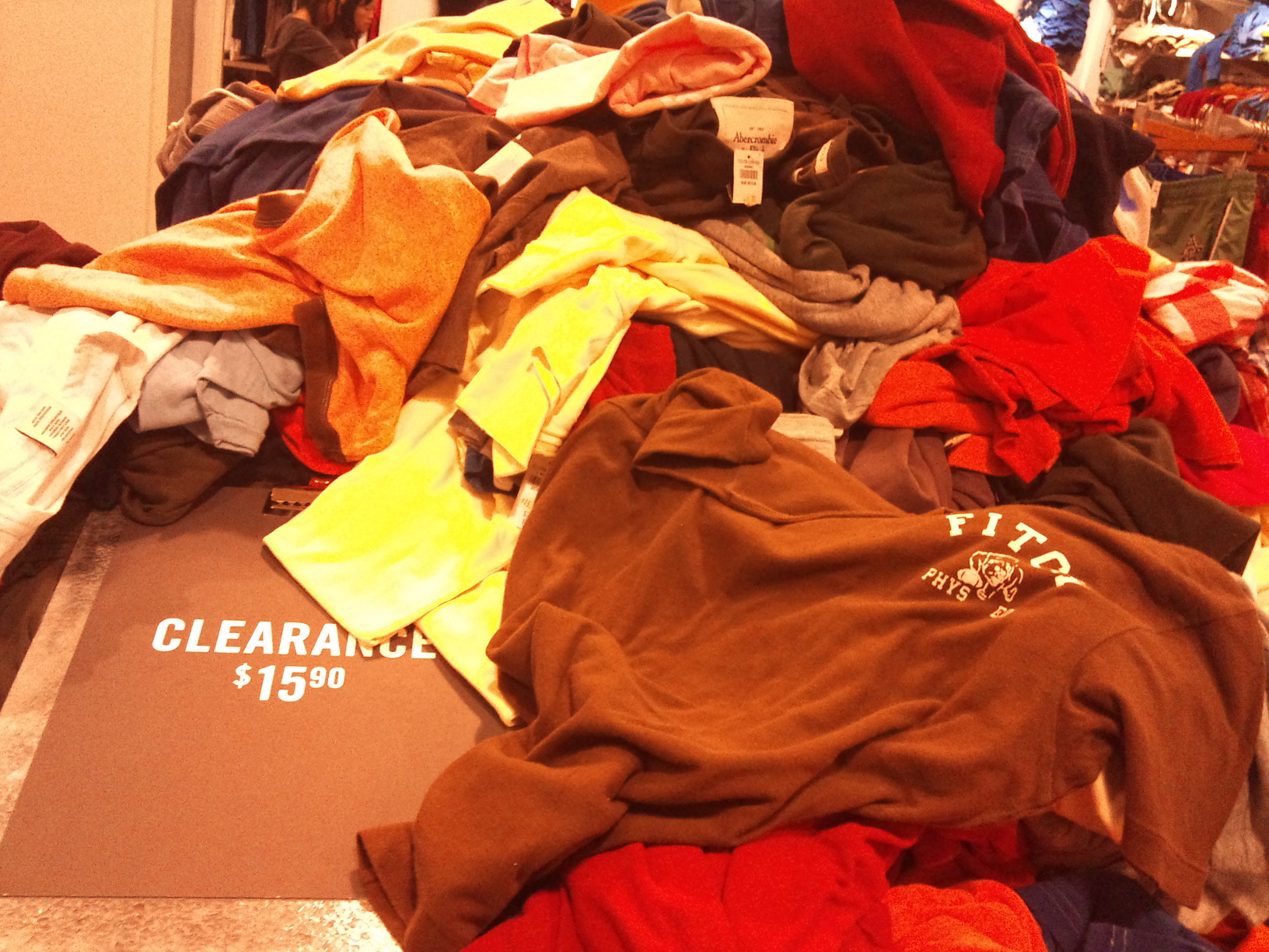 Uma coisa que me deixou chocado foi achar um outlet da Abercrombie & Fitch, tudo jogado num bacião enorme e custando baratíssimo! Coisa de 10 dólares. Para não dizer que estou mentindo tirei até uma foto com o celular.
