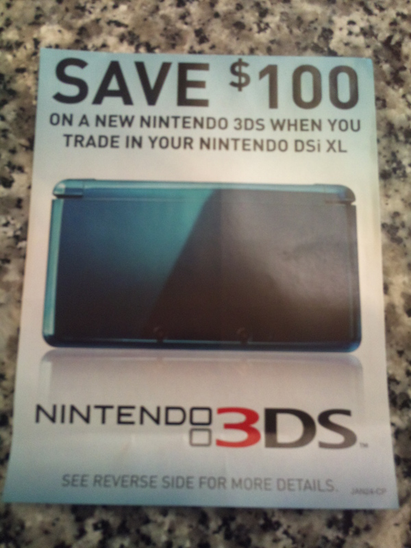 Uma coisa que achei interessante quando estava nos EUA foi o panfleto que a Gamestop, maior loja de games do EUA, liberou para os frequentadores de sua loja. Participando da pré-venda do aparelho e dando o seu Nintendo DSi ou DSi XL como troca você consegue descontos progressivos na compra do 3DS. Dando o DSi XL, você ganha US$ 100 de desconto e o aparelho sai por US$ 149,99.