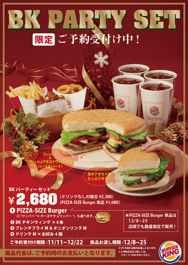 A rede de lanchonetes Burger King vai colocar no cardápio de fim de ano um sanduba com 22 cm, o tamanho de uma pizza. A partir deste mês os japoneses poderão “reservar” seus mega-hamburgueres para consumirem a partir do dia 8 de dezembro até o natal. O sanduba custa nada menos do que 2680 ienes (aprox. R$45). Além do lanche será possível encomendar todo um set com batata frita, cebola e refrigerantes para até quatro pessoas.