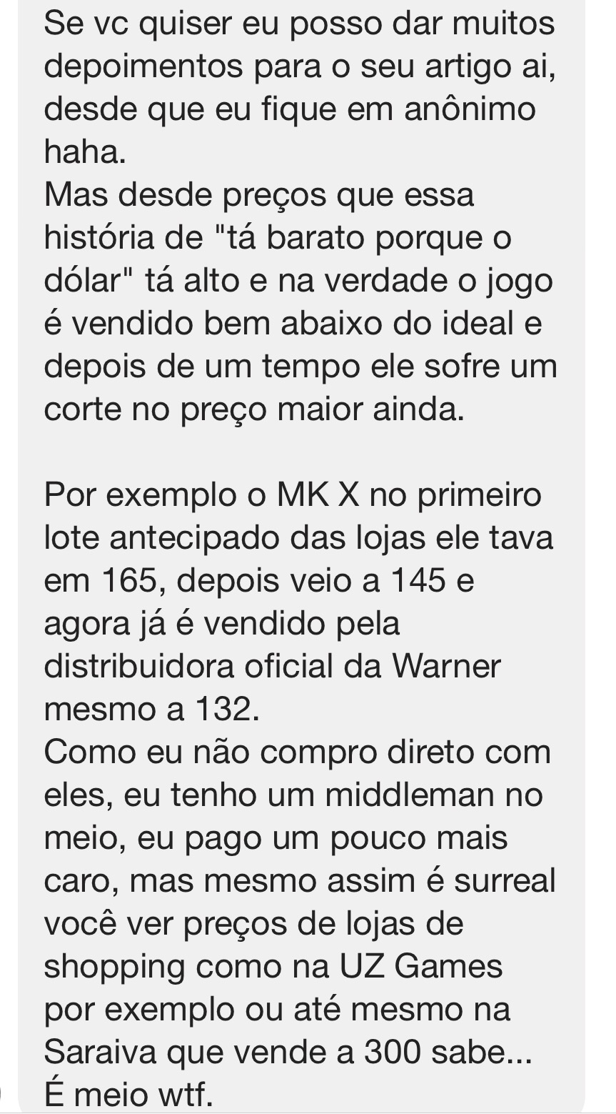 Ótimo texto, Renato, muito bom mesmo. Esse lance das lojinhas do RJ vendendo antecipado é velho conhecido, já vi lançamento por lá uns bons dias antes da data. O mais recente foi The Witcher 3, que nas grandes lojas seria vendido por R$ 230 e lá no Centro do Rio, um dia antes do lançamento, vi vendendo a R$ 250 à vista ou quase R$ 300 parcelado. Vários outros lançamentos, como Zelda Majora’s Mask 3D e Pokémon X/Y também chegaram antes da data e com preços absurdos — mas como tem quem pague, eles continuam vendendo. E, realmente, nessa brincadeira todo mundo sai perdendo.