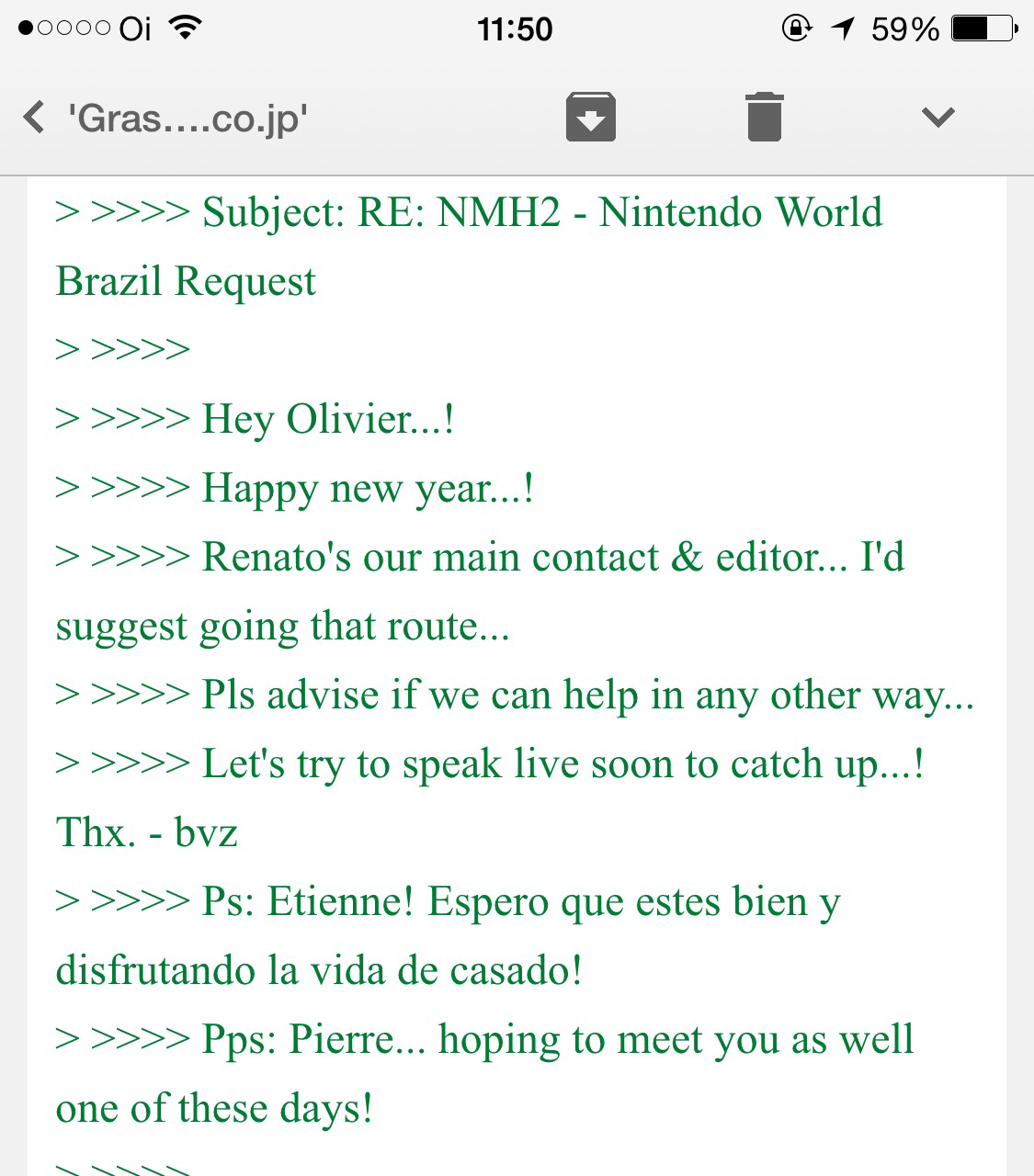 Isso me deixou chateado, mas me lembrei que No More Heroes 2 não era da Ubisoft, mas sim da Grasshopper Manufacture, empresa do Suda 51 no Japão. Fucei na internet e então descolei um telefone maroto. A noite depois que todo mundo foi para casa dei uma ligada por Skype para a empresa japonesa. Falei com a secretária, ela me pediu informações da revista. Enviei tudo. Ela não acreditou muito que um brasileiro maluco tinha ligado pra ela de manhã do nada. Mandou email para a Nintendo japonesa, que mandou para a americana, que por sua vez mandou para a sede da Ubisoft na França que mandou para Montreal. Até que o email chegou em Bill Van Zyll, GM da Nintendo América Latina que não me conhecia na época, mas já sabia o tanto de “barulho” que fazia pra conseguir as coisas e respondeu abaixo: