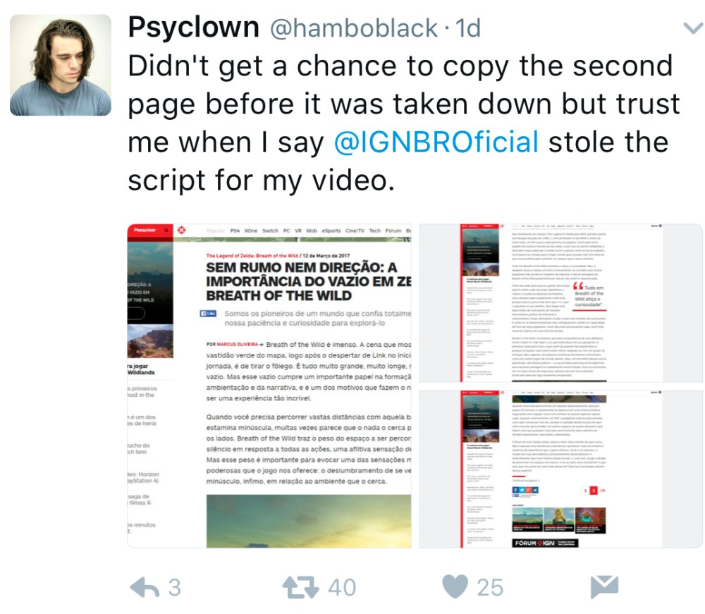 Mas aí temos o que aconteceu com o Marcus Oliveira do IGN Brasil que usou o roteiro de um vídeo do canal “Writing on Games” do youtuber escocês Hamish Black para escrever seu artigo sobre The Legend of Zelda: Breath of The Wild. Ao invés de reinterpretar a ideia em algo novo adicionando mais elementos e apurando os fatos, ele traduziu o roteiro do vídeo de maneira que Hamish colocou o texto no Google Translate e ele saiu exatamente igual. O vídeo em questão é este abaixo: