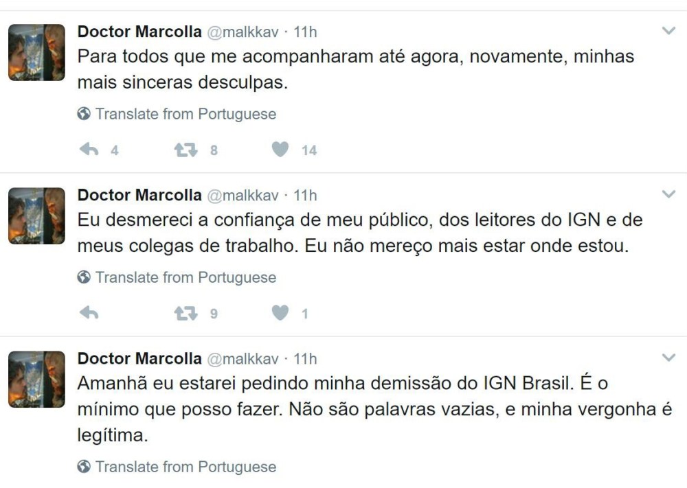 A sequência dessa história rendeu um pedido de desculpas do Marcus pelo twitter ao Hamish (abaixo), a matéria saiu do ar no IGN Brasil logo em seguida e um pedido de desculpas oficial do site foi enviado ao autor.
